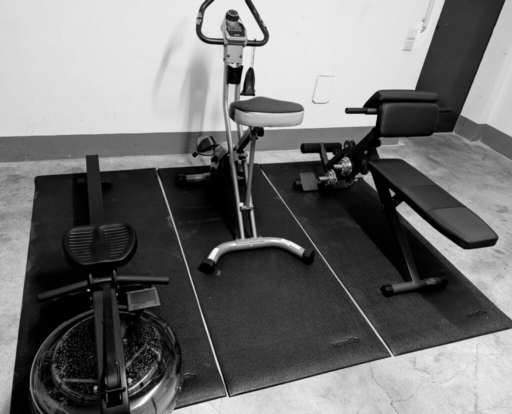 Den Heimtrainer (Rad) und die Hanteln hatte ich schon länger. Allerdings nahm vorallem der Heimtrainer viel Platz in meiner kleinen Wohnung weg. In der Garage ist das nun alles gut aufgehoben und an einem Ort.